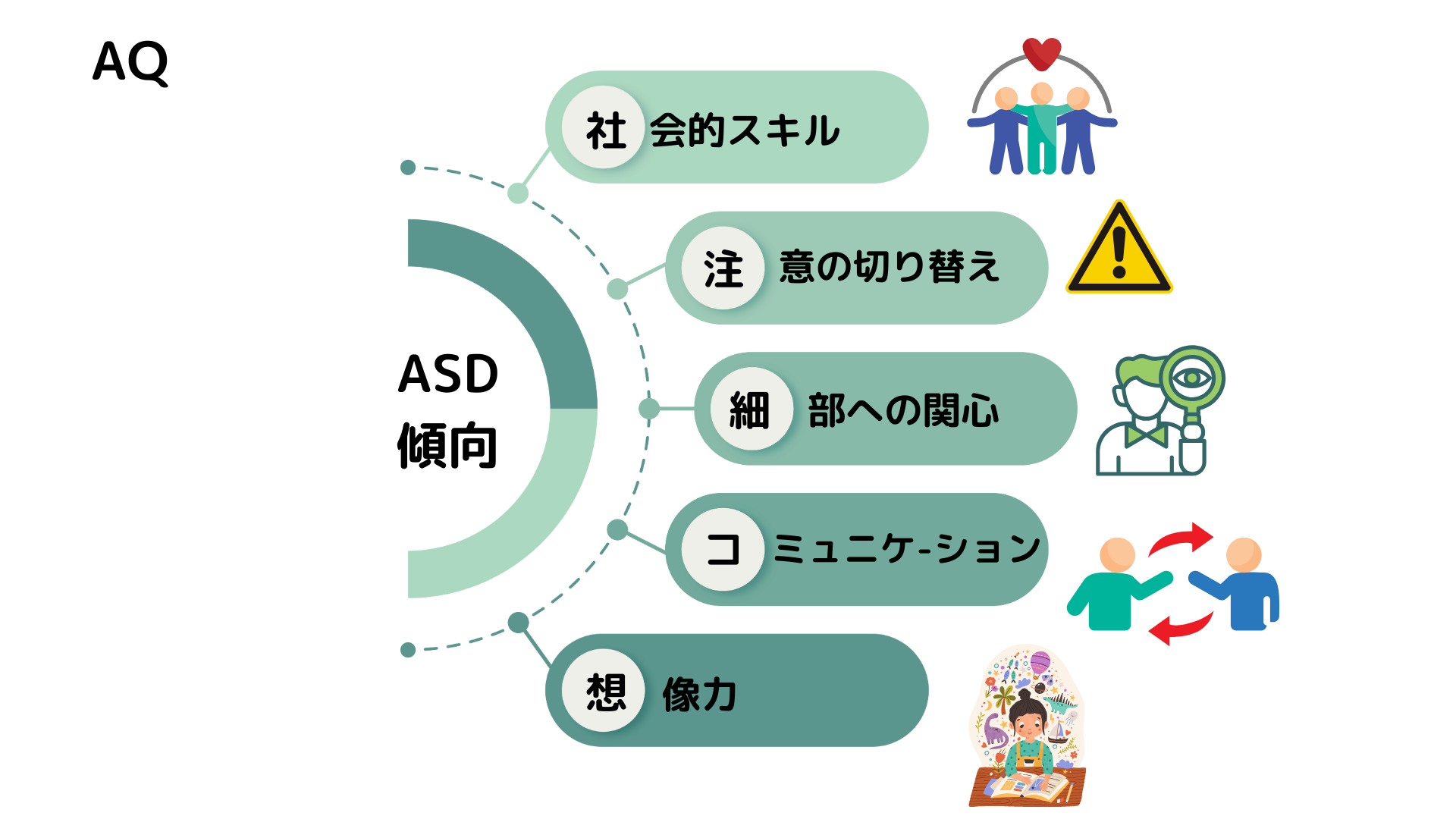AQは、自閉症スペクトラム症(ASD)の自己評価尺度です。 個人の自閉症傾向を測定する目的で開発され、高機能自閉症やアスペルガー障害を含む自閉症スペクトラム障害のスクリーニングにも使用されています。