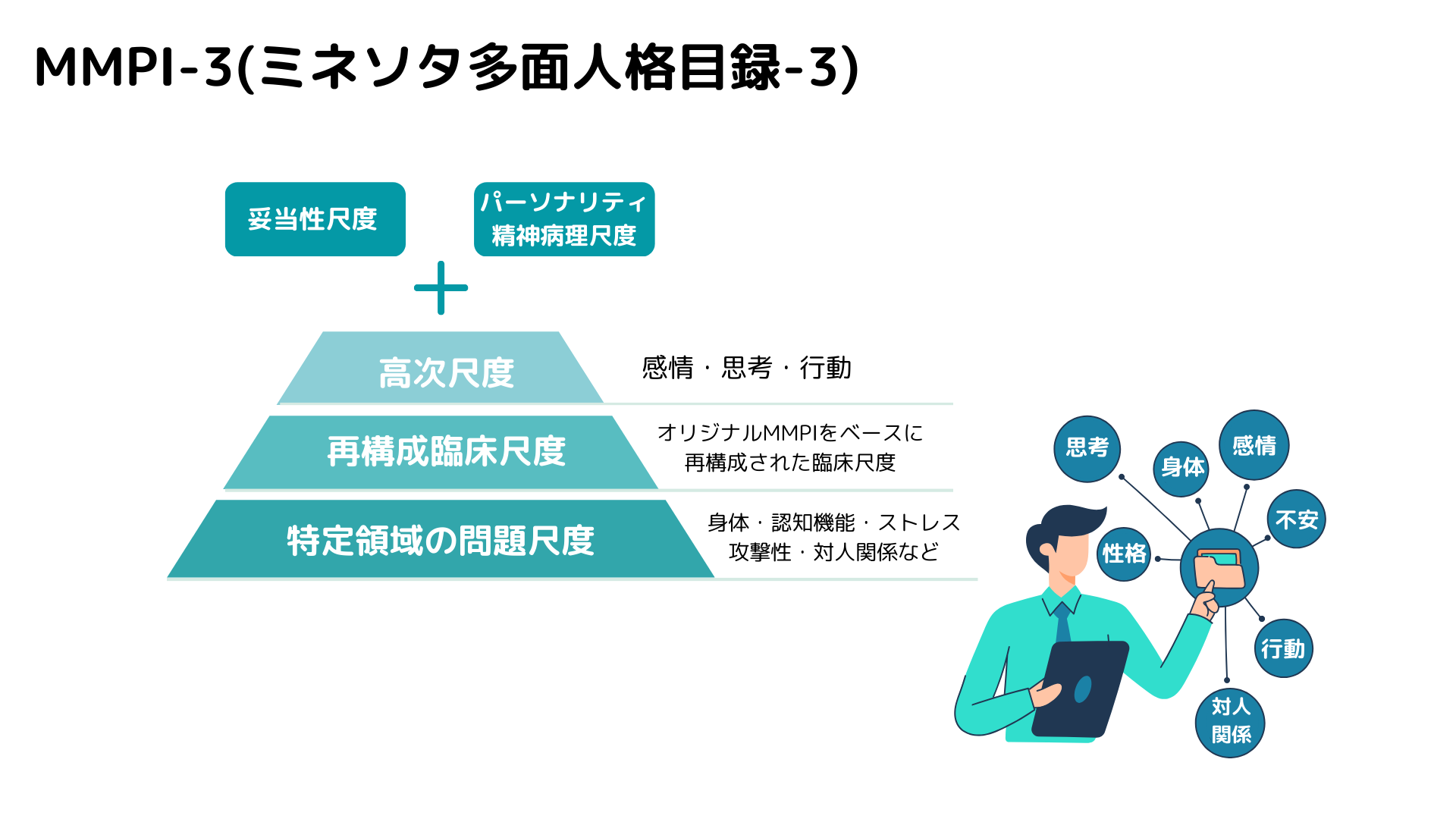 MMPI-3は質問紙法に基づく、精神医学と心理学の知見を反映した性格検査です。335問の質問に対して「はい(あてはまる)」「いいえ(あてはまらない)」「どちらでもない」のいずれかを選択することにより、52の指標から人の性格特性を多角的に評価できます。